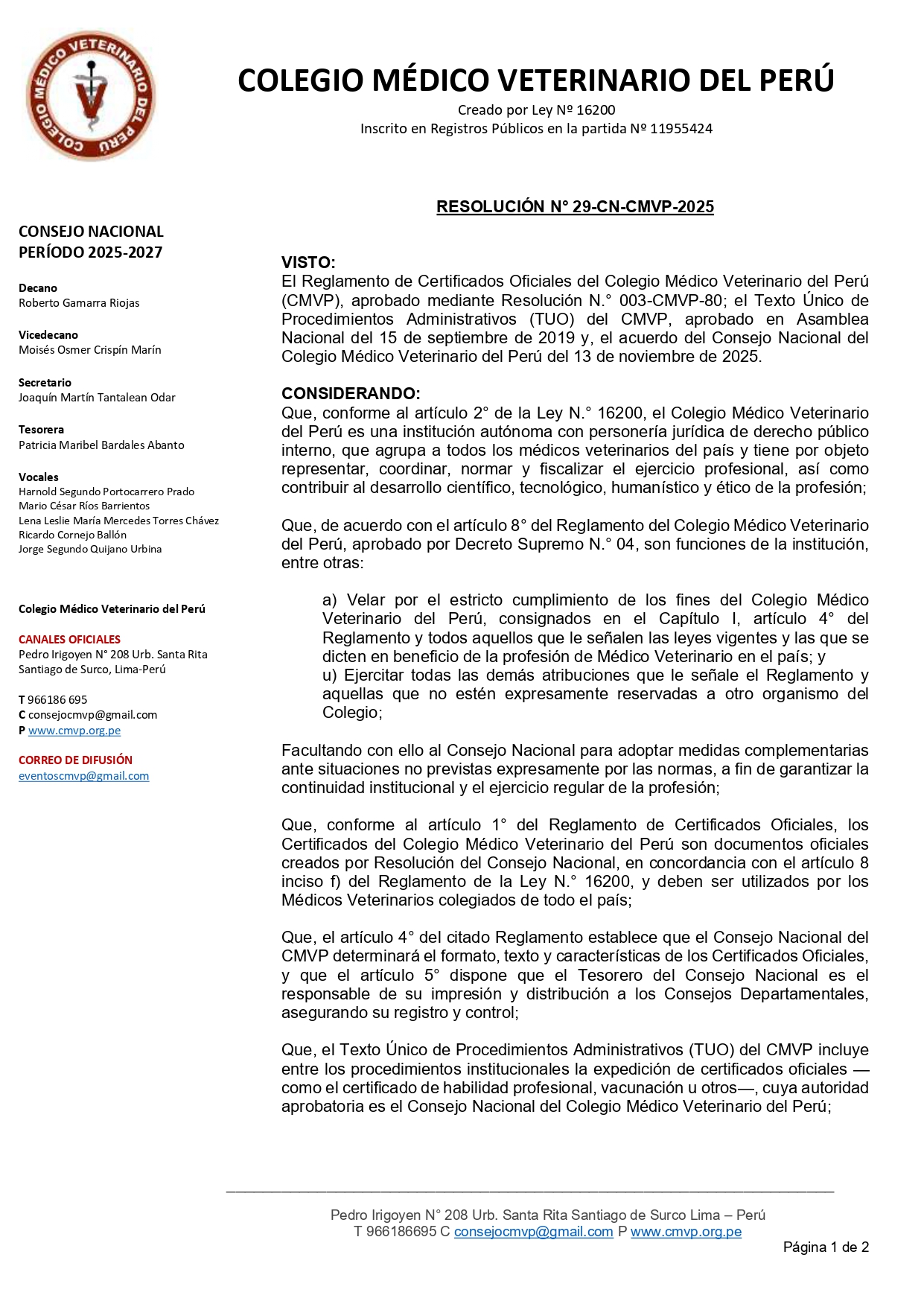 Resolución de Certificados Oficiales a través Colegio Médico Veterinario del Perú