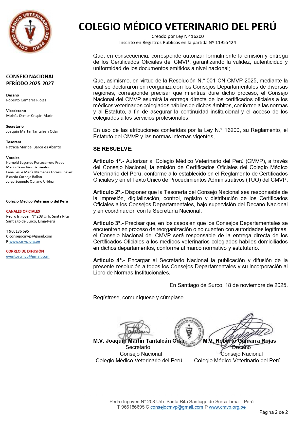 Resolución N.° 003-CN-CMVP-2025, de fecha 10 de febrero de 2025, mediante la cual el Consejo Nacional del Colegio Médico Veterinario del Perú declaró en estado de reorganización, entre otros, al Colegio Médico Veterinario Departamental de Piura