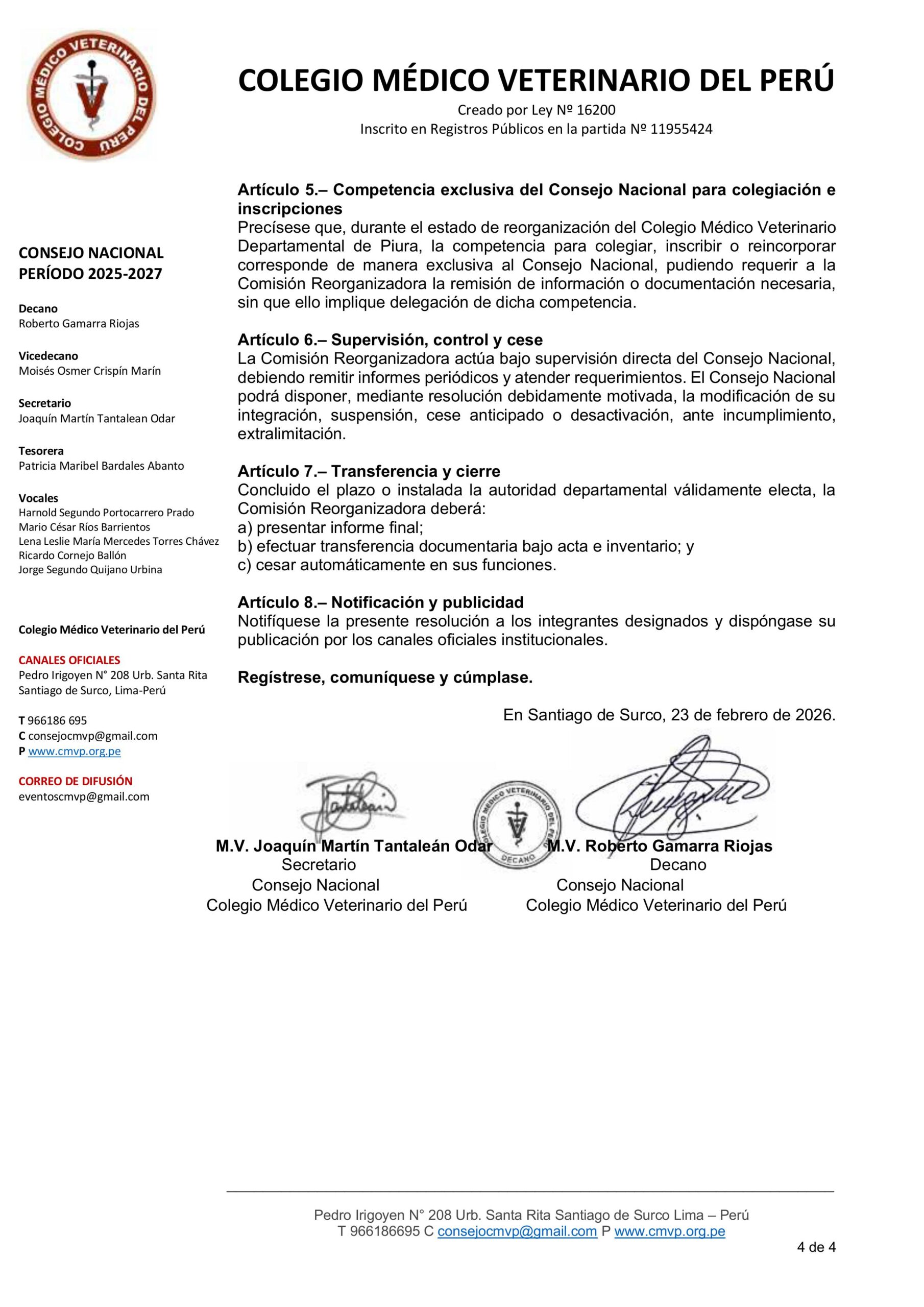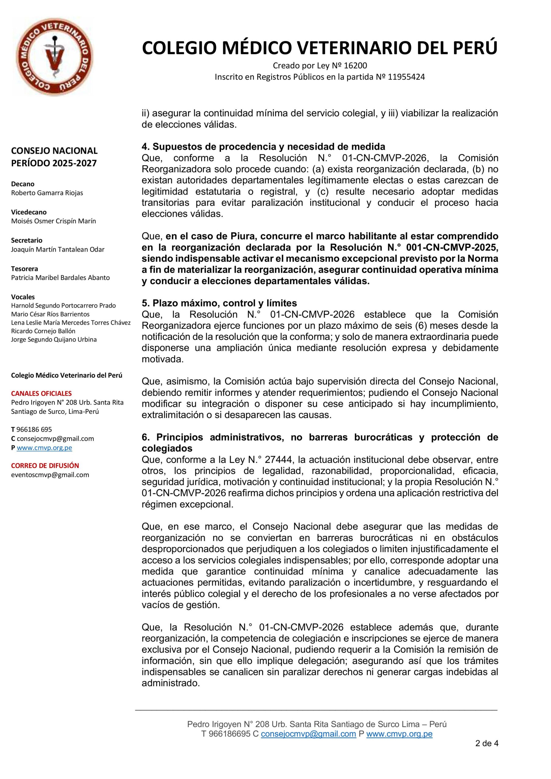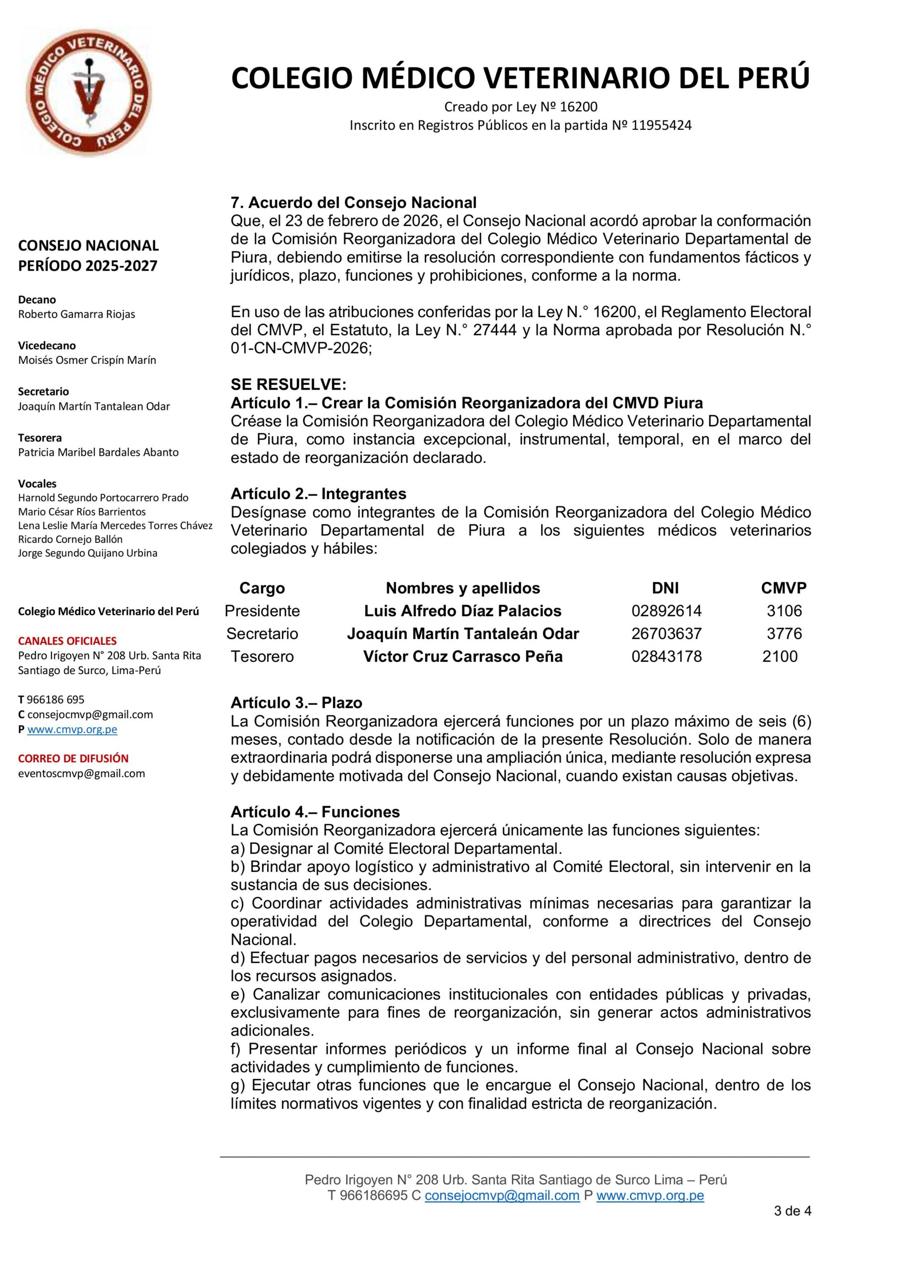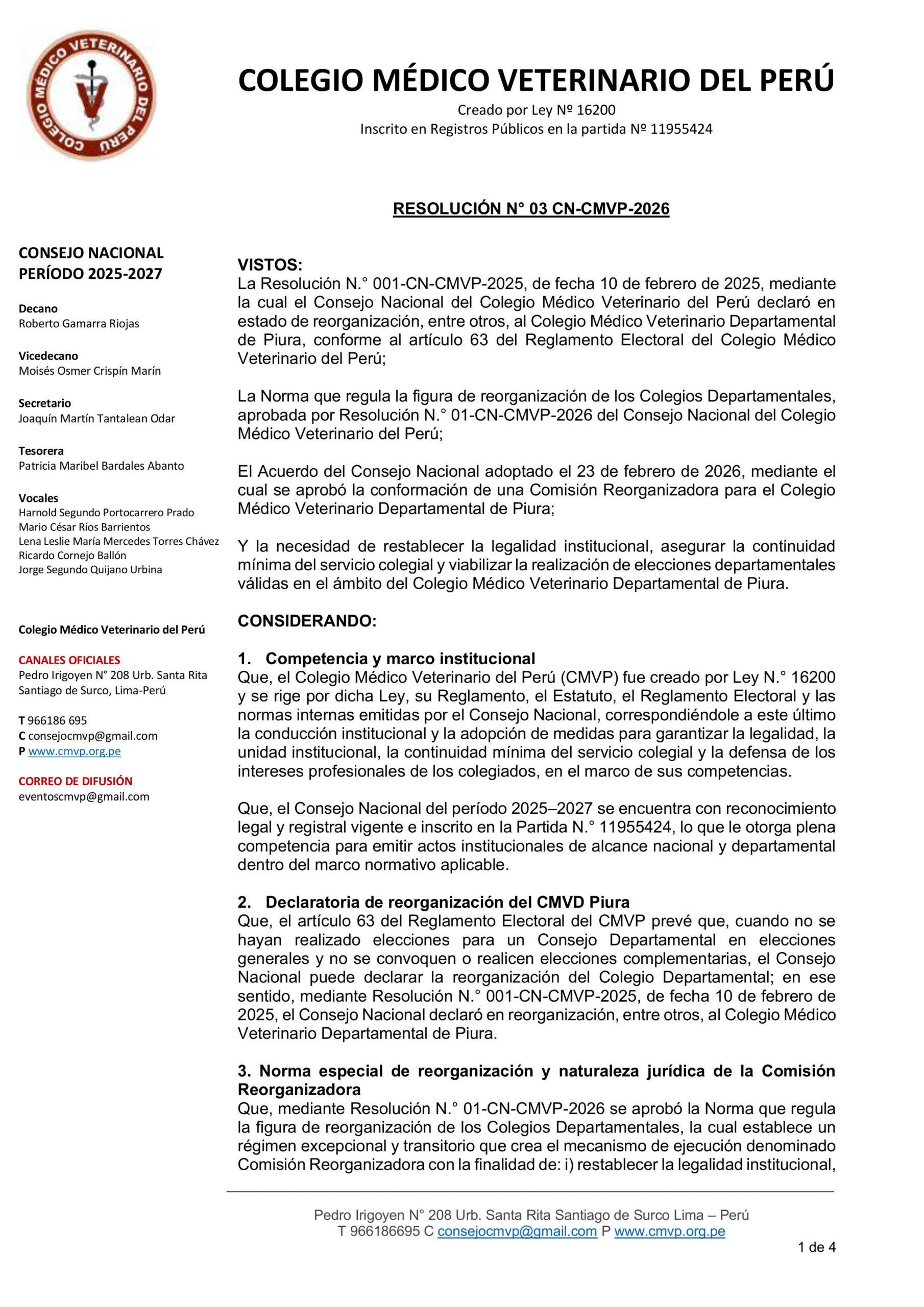 Resolución N.° 003-CN-CMVP-2025, de fecha 10 de febrero de 2025, mediante la cual el Consejo Nacional del Colegio Médico Veterinario del Perú declaró en estado de reorganización, entre otros, al Colegio Médico Veterinario Departamental de Piura